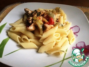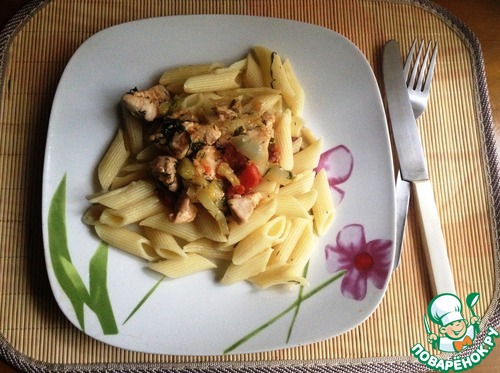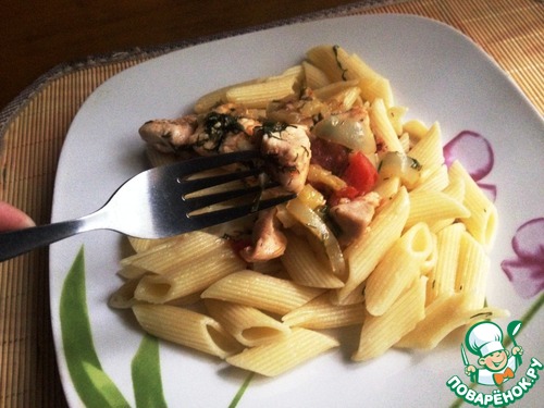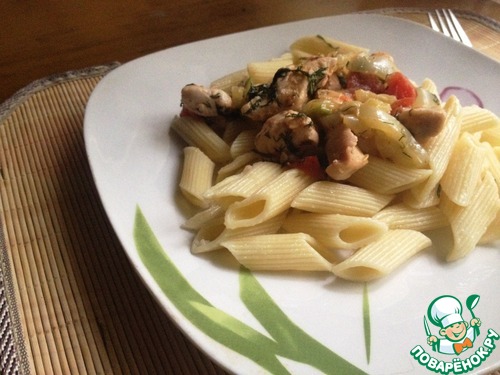 Выложите пенне на тарелку, сверху - курицу с овощами.