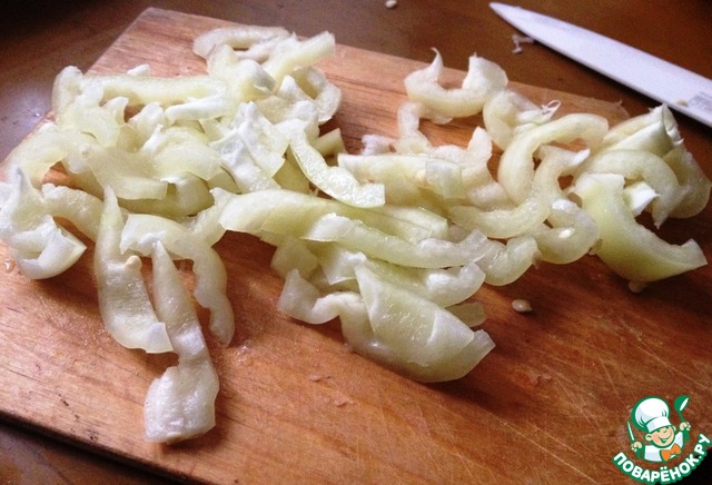 Перец вымыть, обсушить, удалить семена и нарезать полосками. Добавить к курице с луком. Перемешать. Уменьшить огонь до среднего.