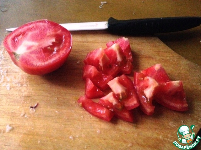 Помидор нарезать ломтиками. Добавить кабачок и помидор в сотейник. Перемешать.
