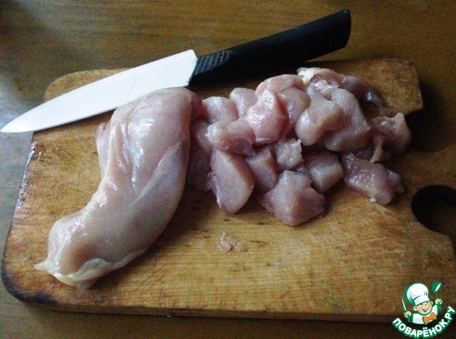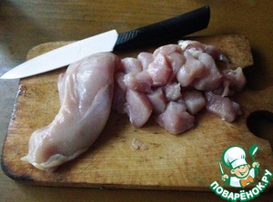 Филе вымыть, обсушить, нарезать небольшими кубиками. Посолить, посыпать приправой.