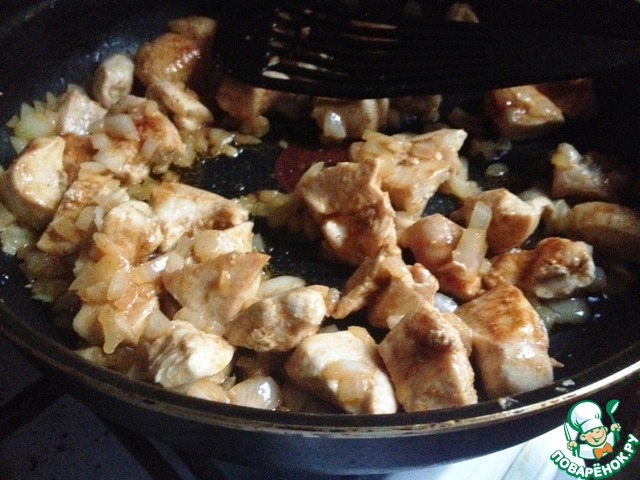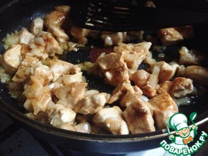 • В сотейнике разогреть растительное масло и обжарить курицу почти до готовности. Выложить на тарелку.