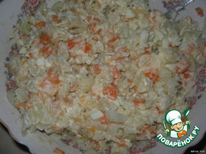 Подготовим продукты для салата. Морковь, яйца отварить. Цветную капусту отварить в подсоленной и слегка подслащенной воде. Репчатый лук нарезать соломкой и обжарить на растительном масле.