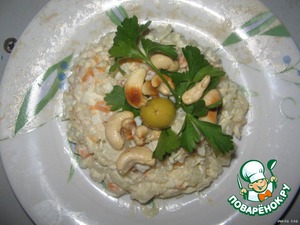 Готовый салат лучше подавать порционно, выложив на тарелку в виде небольшого островка. Украсить орешками, зеленью и оливкой. ПРИЯТНОГО АППЕТИТА!!!