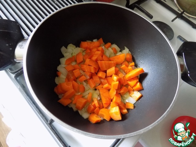 Для готовки супа лучше взять кастрюлю с толстым дном, в ней мы будем обжаривать овощи, а затем сразу варить суп. Можно воспользоваться сковородой. Наливаем 1 ст л оливкового масла, которое можно заменить на подсолнечное. Вторую ложку оставляем для добавления в готовый суп в самом конце готовки. Когда масло разогреется, выкладываем лук, золотим его. Не нужно сильно обжаривать овощи. Нужно только чтобы овощи пропитались маслом. Далее -морковь.