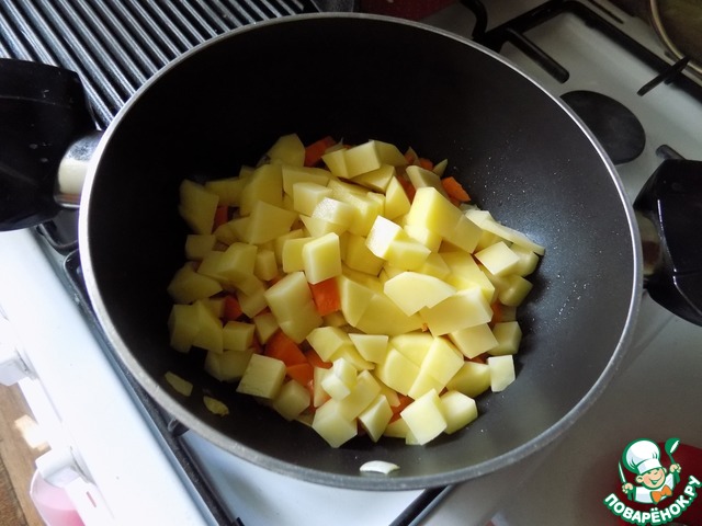 Когда масло закрасится цветом моркови добавляем картофель. Ещё немного обжариваем всё.