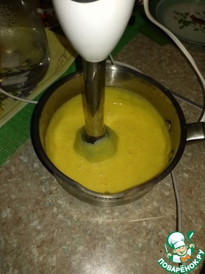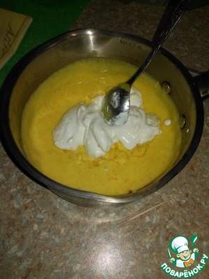 Сок и цедру апельсина, сахар, масло, желтки и яйцо отправляем в ковш с толстым дном и доводим до загустения.