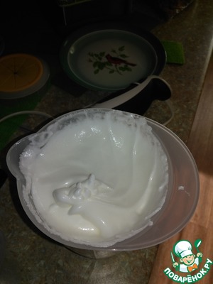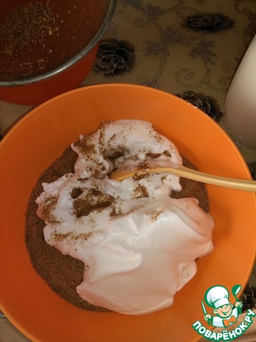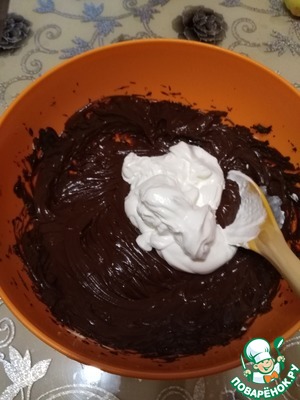 Вводим в шоколадную массу взбитые белки. Я сразу взбила всю массу белков и разделила их на порции: в апельсиновый и шоколадный крем.