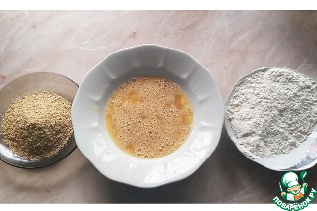 Рулетики обвалять сначала в муке, затем в яйце а потом в панировочных сухарях.