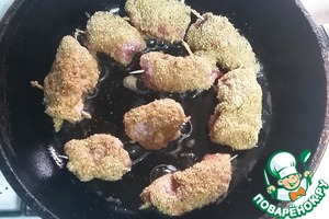 Обжарить рулетики на сковороде со всех сторон до золотистого цвета.