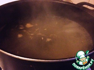 • Слитую жидкость довести до кипения, всыпать сахар и соль. Кипятиь до растворения.