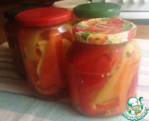 Хочу показать вам одну закрутку прошлого года. Это традиционная заготовка в нашей семье. Если использовать перец разных цветов, то выглядят баночки очень нарядно. Зимой это просто находка - яркий, вкусный перец! Кроме того, данный способ маринования не требует последующей стерилизации банок с готовым продуктом. Перец хорошо хранится в квартире во встроенном шкафу. Готовлю такой перец с начала девяностых, перец ни разу не взрывался. Рецепт раньше не вставляла, т к раскладка идёт двойная: в расчёте на банку и в расчёте на 1 л заливки. Количество используемых банок будет зависеть от плотности укладки перца.