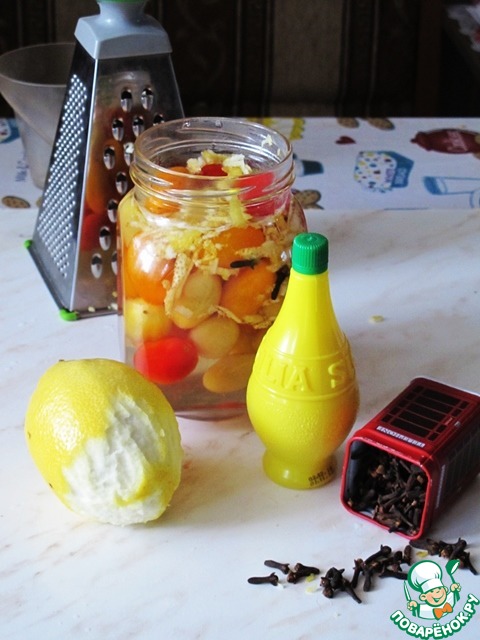 Черри положить в простерилизованную банку, добавить натертую лимонную цедру и гвоздику. Залить горячим сиропом, процеженным через марлю.