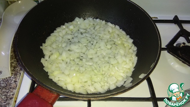 • Обжариваем на оливковом масле мелко нарезанный лук до золотистого цвета...