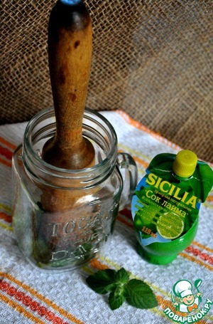 • В высокий стакан добавим листья мяты, чайную ложечку сахара, 1 чайную ложечку сока лайма " SICILIA" и слегка потолкём пестиком.