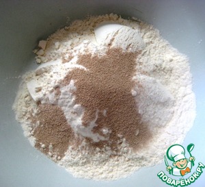 В миске соединить муку (примерно половину необходимого количества), дрожжи, соль и сахар.