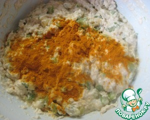 Добавить куркуму и, постепенно всыпая оставшуюся часть муки, замесить тесто.