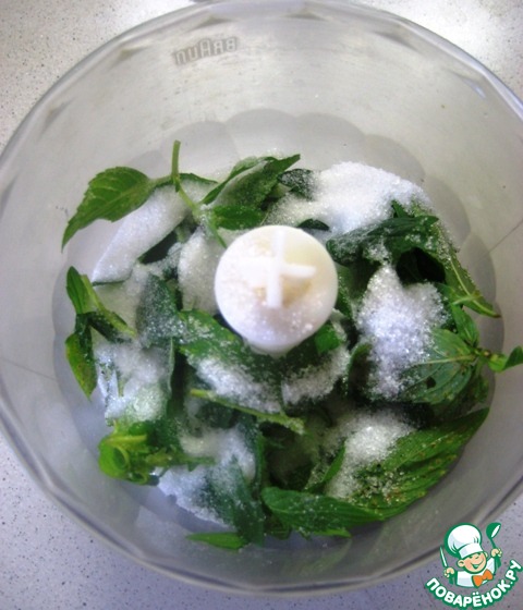Для начала мяту вымыть, просушить бумажным полотенцем, сложить в чашу блендера, всыпать 2 ст. л. сахара.