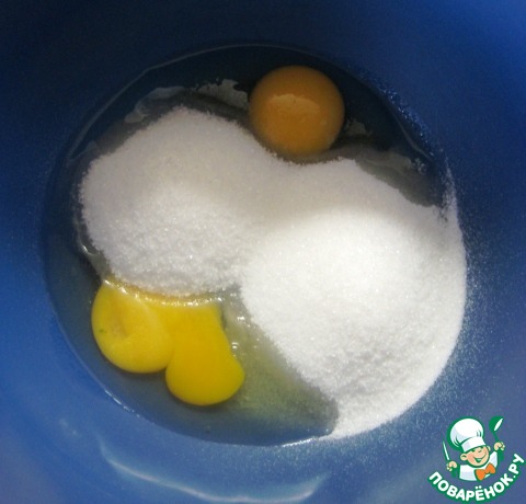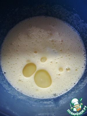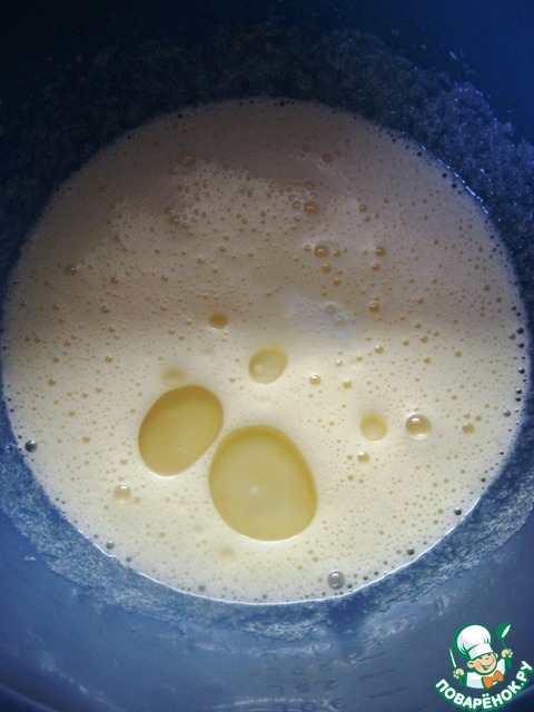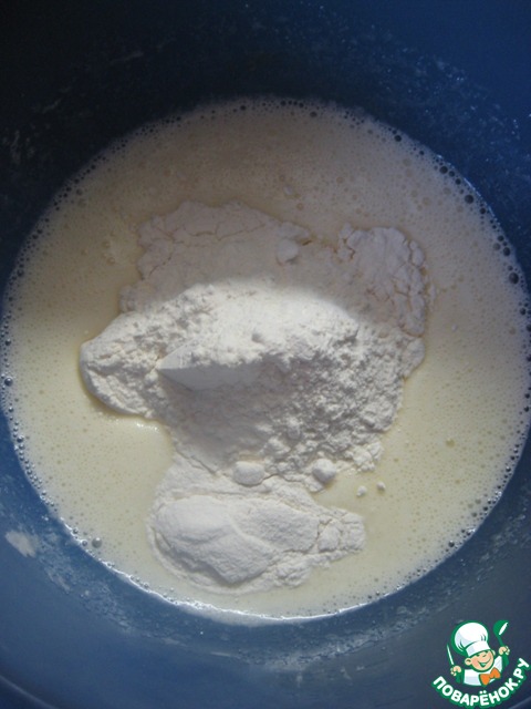 Добавить муку и разрыхлитель теста. Перемешать до однородного состояния (тесто по консистенции как на густые оладьи).
