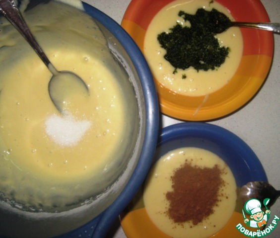 Разделить тесто на три части. В одну добавить ванильный сахар, во вторую - какао, в третью - мятно-сахарную кашицу.