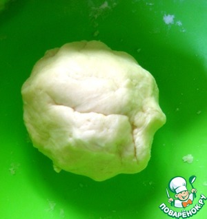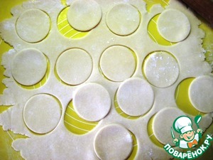 Охлажденное тесто раскатать в тонкий пласт на подпыленной мукой поверхности, вырезать четное количество кружочков-заготовок (остатки теста собрать и снова убрать в холодильник, затем использовать и их, раскатав и вырезав заготовки).