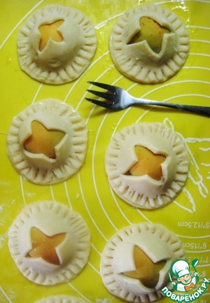 В центре второй части кружочков-заготовок сделать надрезы "крестом" острым ножом, уложить сверху на первую, чуть прижимая к смазанным яйцом краям. Затем вилочкой аккуратно пройтись по краешку печенья, прижимая.