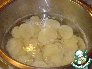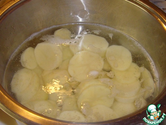 Картошку чистим, режем на кусочки, складываем в кастрюлю. Залить воды на 5 см выше картошки. Варим до готовности, около 20 минут.
