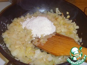 Лук режем мелким кубиком. Обжариваем на сливочном масле до золотистого цвета. Добавляем муку, и тоже обжариваем. Вливаем половник "бульона" из под картошки, очень тщательно размешиваем.