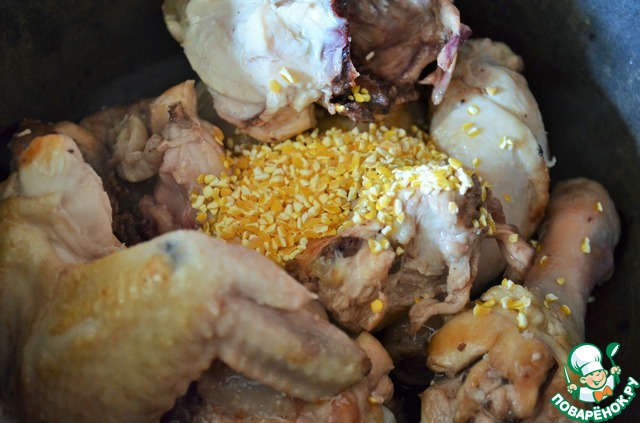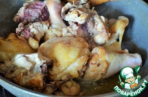 Выложить обжаренную курицу в казан, жир оставить в сковороде.
