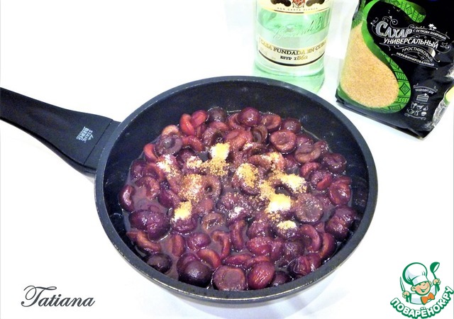 Карамелизуйте вишню до полного растворения сахара (минут 5-7), влейте ром,"подожгите" (фламбируйте). -