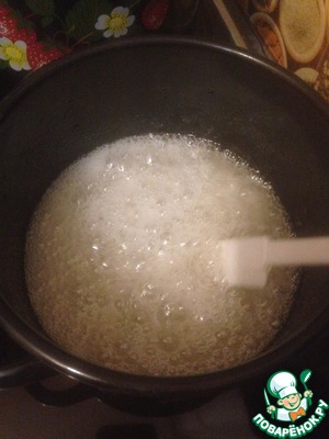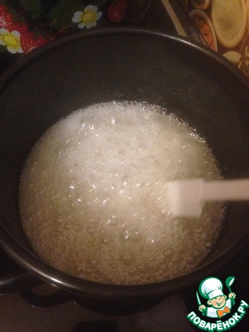 За сутки до готовки бисквита я делаю безе. Берем 4 куриных белка, взбиваем до устойчивых пиков. В кастрюльку высыпаем 2 стакана сахара и 1 стакан воды, готовим сироп, как только сироп закипит, отчитываем 3-4 минуты и снимаем с огня, добавляем в белки и продолжаем взбивать минут 6.