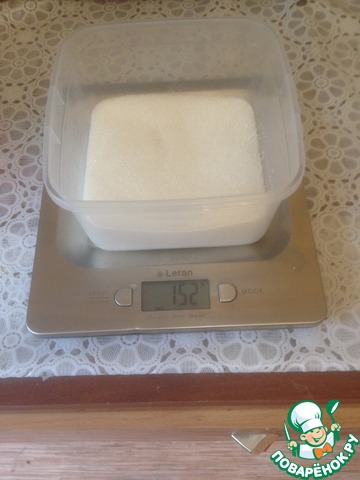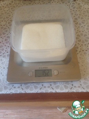 Приступаем готовить бисквит. Взвешиваем на весах 150 грамм сахара.