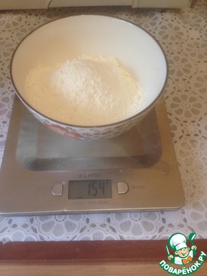 150 грамм муки, в муку добавляем 1 ч. л. разрыхлителя.