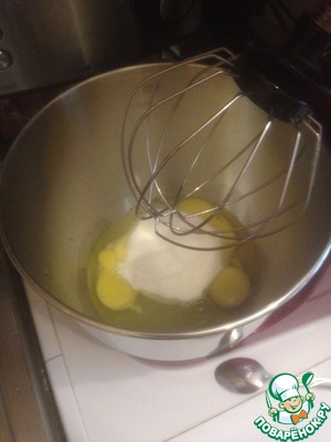 4 куриных яйца взбиваем с сахаром, взбить нужно чтобы оставались устойчивые пики от венчика.