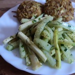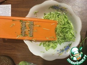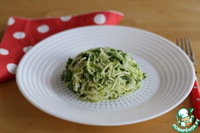 Так как салат идёт на детский завтрак (моим 4 и 2), то чаще я тру на терках, например для « моркови по-корейски». Так даже быстрее получается, если терка будет мельче, то сока от овощей будет больше - это уж кто как любит)