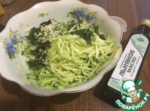 Заправляем маслом (у нас льняное, иногда горчичное холодного отжима), солим, добавляем любимые специи (например дочь любит добавить щепотку куркумы, её вкуса не ощущается в салате, наверно дочери нравится больше сам процесс)