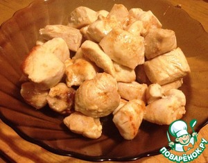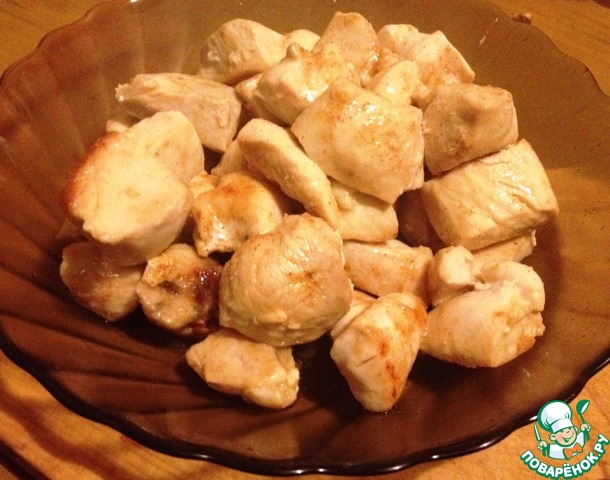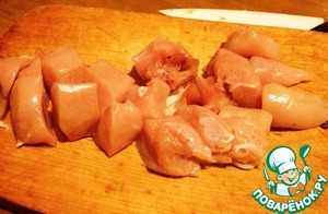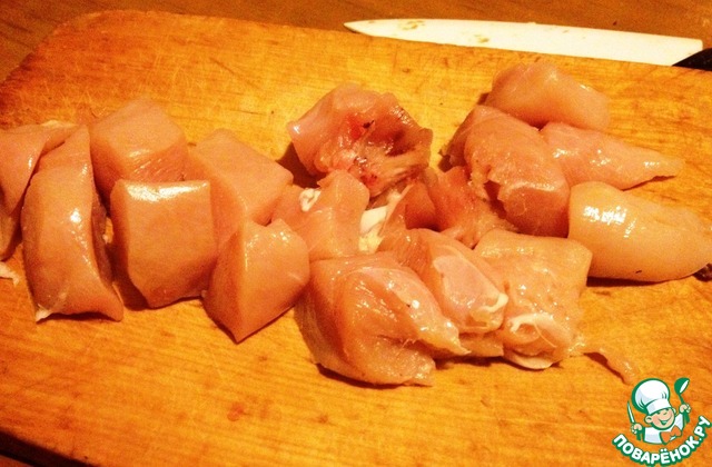Филе вымыть, обсушить, нарезать кубиками со стороной 2 см.