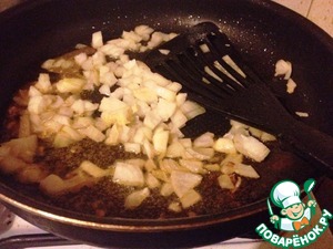 Репчатый лук очистить и нарезать кубиками. Выложить в сотейник и обжарить до золотистого цвета.