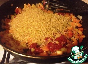 Чеснок очистить, измельчить. Добавить в сотейник вместе с томатной пастой, специями, булгуром. Жарить помешивая 2 минуты.
