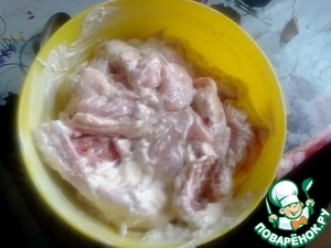 Курицу разделаем на куски, посолим, поперчим, добавим майонез. Чеснок натрем на терке или выдавим через пресс туда же. Перемешаем и отставим мариноваться. Обычно хватает 20 мин.