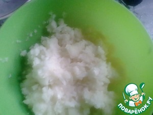 Пока тесто отдыхает, чистим и мелко режем лук. Я в этот раз попробовала измельчить лук блендером, не понравилось. Весь сок стек. Лучше ножом.
