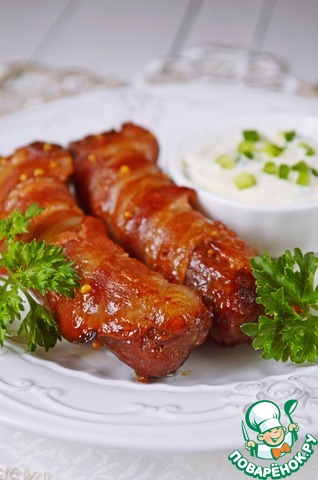 Чевапчичи обернуть полосками бекона выложить на противень или решетку гриля, смазать при помощи кулинарной кисти глазурью.