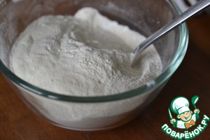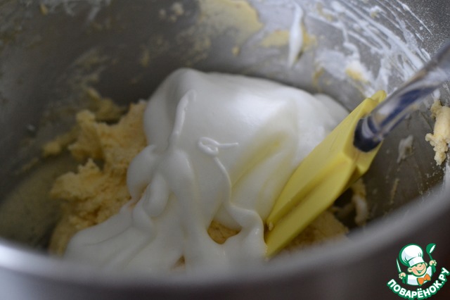 Добавить по ложкам муку, смешанную с разрыхлителем