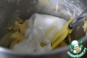 Белки взбить со щепоткой соли и оставшимся сахаром.