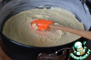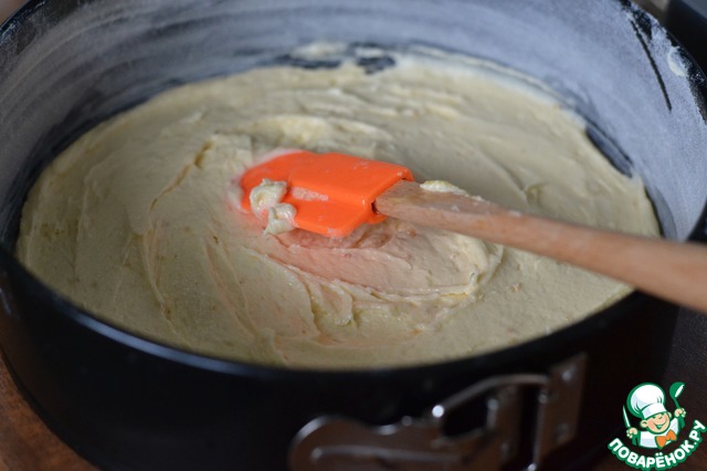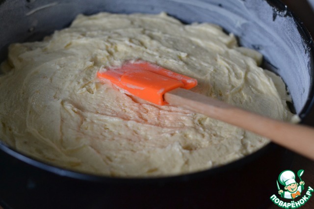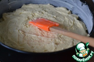 Выкладываем половину теста. Разровнять лопаткой, смоченной в воде. -