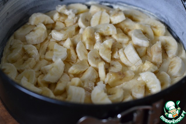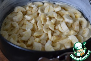 На бананы выкладываем вторую половину теста. Разровнять лопаткой.