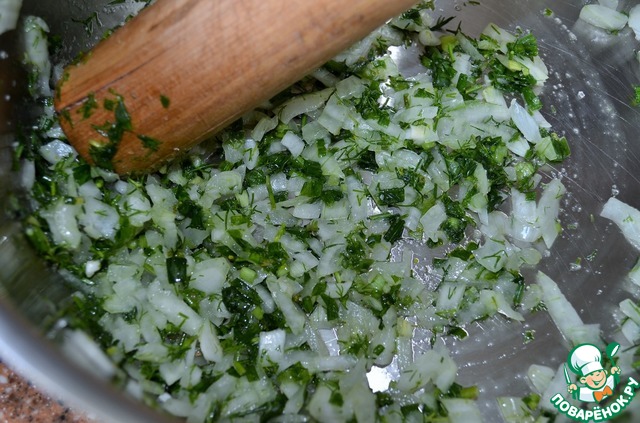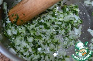 • Лук нарезать мелко, зелень вымыть, нарубить.