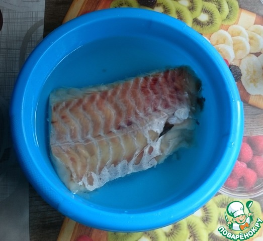 • На следующий день, утром, днем, вечером, (здесь уже на Ваш выбор), наливаем в миску воду. Добавляем чайную ложку соли, столовую ложку яблочного уксуса и щепотку сахара. Хорошо перемешиваем. Кладем в миску филе трески. Воды не нужно много, только чтобы немного покрывала рыбу. Оставляем на 20-30 минут.