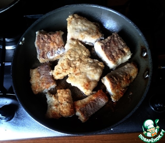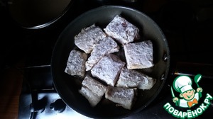 • Треску обсушиваем салфеткой, нарезаем на порционные куски, проверяем на оставшиеся косточки, перчим, обваливаем в муке.
