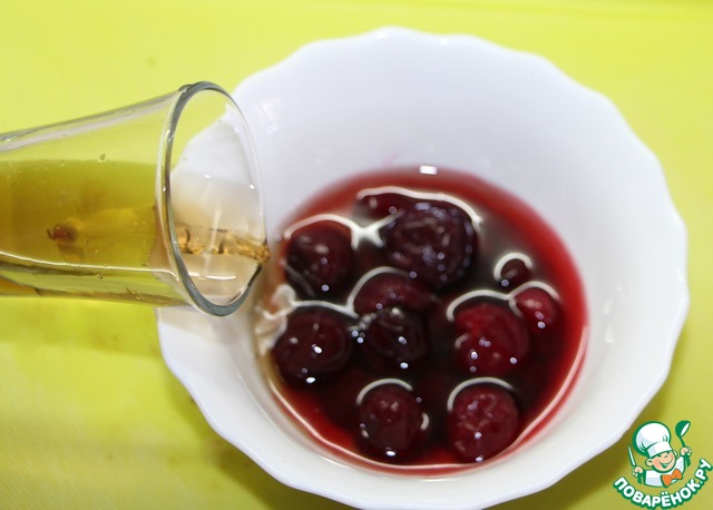 Залить коньяком вишню (замороженную предварительно разморозить и слить жидкость), если вишня кислая, добавить щепотку сахара.