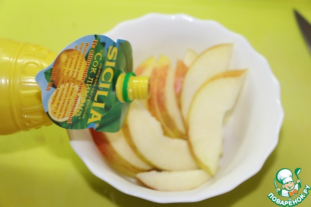 Яблоко или грушу разрезать пополам, удалить сердцевину и нарезать тонкими ломтиками. Незамедлительно сбрызнуть соком лимона, в данном случае лимонным соком HAAS, чтобы мякоть не потемнела.